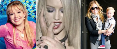 | Hilary Duff como Lizzie Mcguire (2001), en el videoclip de Reach Out (2008) y con su hijo Luca (2014) |